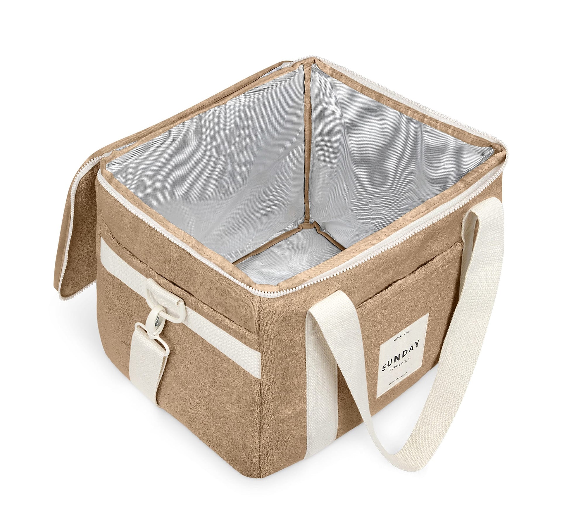 Our take on the Australian “Esky”, the Cooler Bag is made from our signature 100% Terry Towelling outer, insulated lining and zipped with YKK zip hardware.    Designed to fit all your essentials the Cooler Bag has two thick canvas handles, an extendable over the shoulder strap and three external pockets, giving you more room and comfort to carry a days-trip worth of supplies.