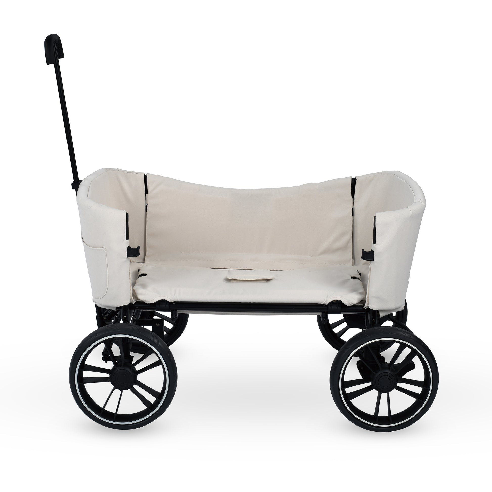 Made from our signature recycled polyester fabric, the beach wagon features removable padded cushion covers that are water and UV resistant. Making it comfortable inside the buggy and easily cleaned for those messy spills. Featuring a premium SUNDAY embroidered logo and a unique strap and clip design, the Beach Trolley has extra practicality for carrying your Beach Umbrella or Beach Cabana. With extra pockets and features this folding beach trolley has an outstanding 110 Litre capacity, so you can fit everything the entire family needs for those long days at the beach.