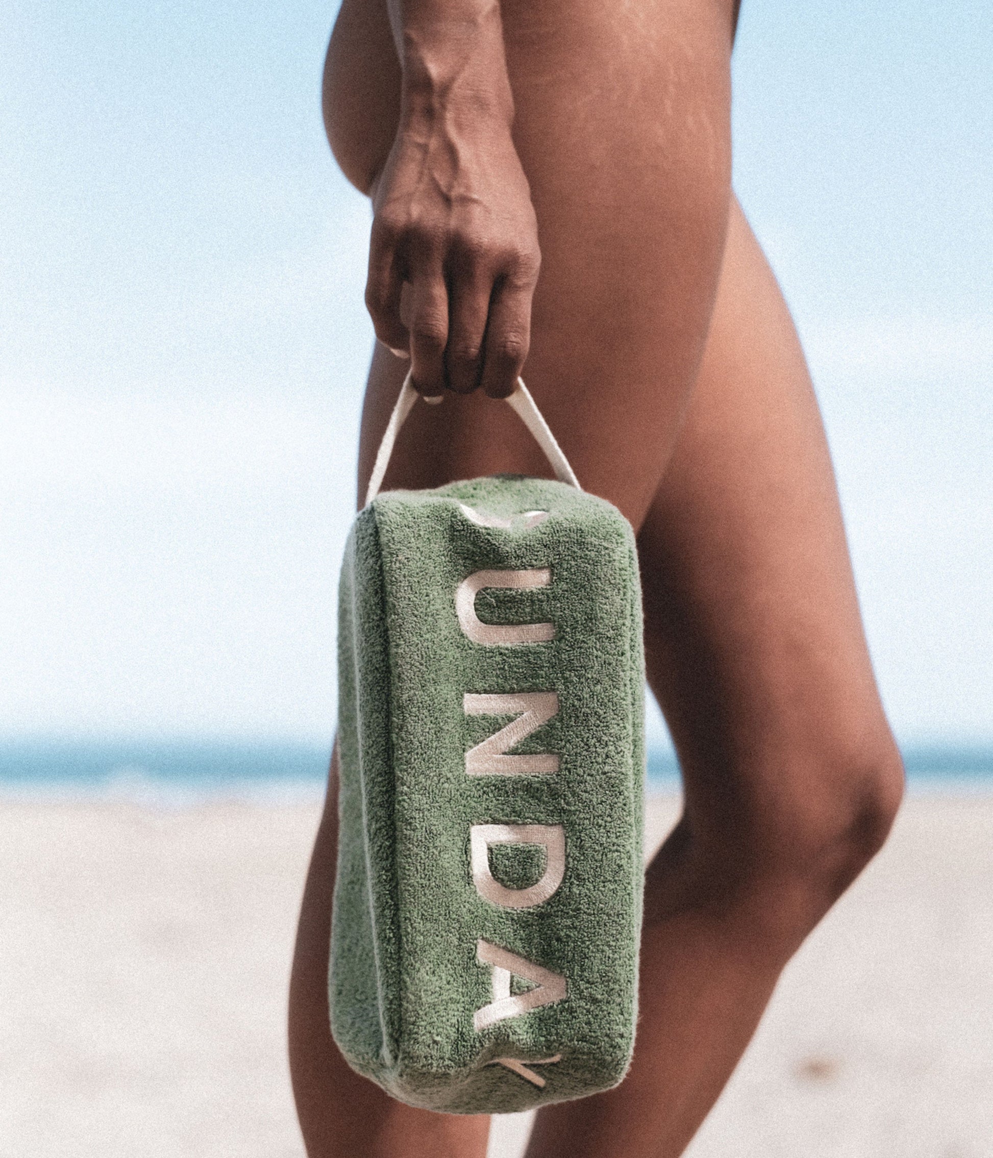 Featuring a 100% terry towelling outer, lined with heavy duty cotton canvas and zipped with premium YKK zip hardware. A thick canvas handle is attached to a single side of the pouch and our signature ‘SUNDAY’ patch logo is featured on the front with our embroidery on the bottom.